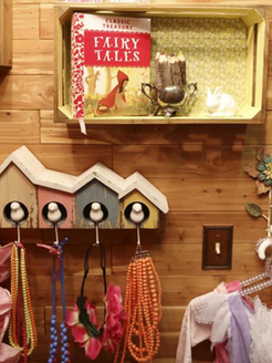Inspired by a cedar-paneled closet, designer Paula Chamblin crafted a “treehouse” playroom for a young girl that includes canvas clouds hanging from the ceiling. The retreat features a small leather sofa, a place to hang dress-up clothes and a crystal chandelier.